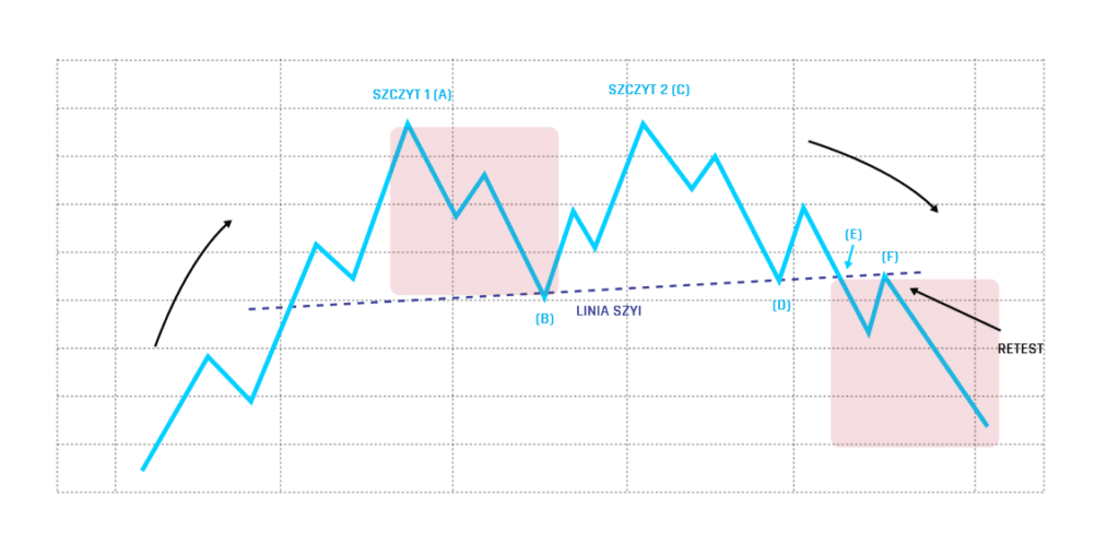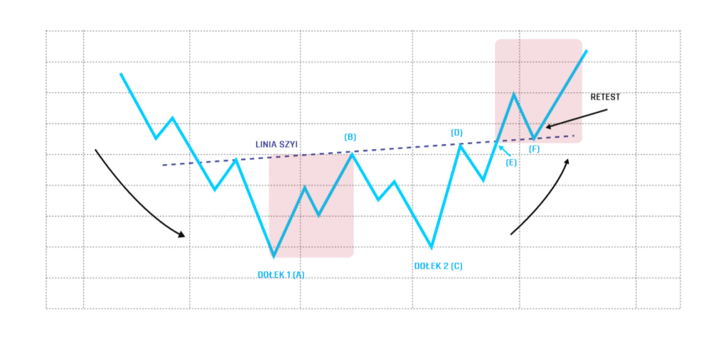 Po wzroście/spadku do punktu A cena dokonuje korekty do punktu B, a następnie powraca do wzrostu/spadku. Jednakże cena nie ma siły przebicia się przez szczyt/szczyt (A) i cena spada/wznosi się do punktu oznaczonego (D). W ten sposób można wyznaczyć potencjalną linię szyi, która jest pozioma lub lekko przekątna. Sygnałem sprzedaży/zakupu jest jego dynamiczne przebicie (E). Mówiąc „dynamiczna” mam na myśli wysoką zmienność, która jest pokazana na wykresie przez świecę o dużym korpusie. Po przebiciu tego oporu, cena bardzo często „zawraca”, testując ją ponownie. Mówimy tu o ponownym teście. Książkowa wersja formacji „M” lub „W” zakłada, że wierzchołki/doliny są na tym samym poziomie. Oczywiście, pewne odstępstwa od tej reguły są dopuszczalne. Poziomy te mogą się nieznacznie różnić, nie wpływając na wiarygodność formacji.