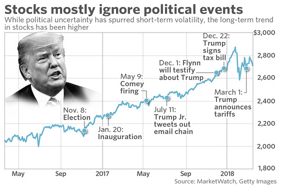 Kiedy na przykład w listopadzie 2016 roku Donald Trump został wybrany na prezydenta Stanów Zjednoczonych, amerykańska giełda papierów wartościowych wykazywała bardzo silną, długoterminową tendencję wzrostową. Tak jest nadal, ponieważ obiecał niższe podatki od osób prawnych, co oznaczało wyższe zyski przedsiębiorstw. Pierwotną reakcję na internetowe notowania amerykańskiej giełdy po wyborach Trumpa widać na poniższym długoterminowym wykresie indeksu S&P 500: