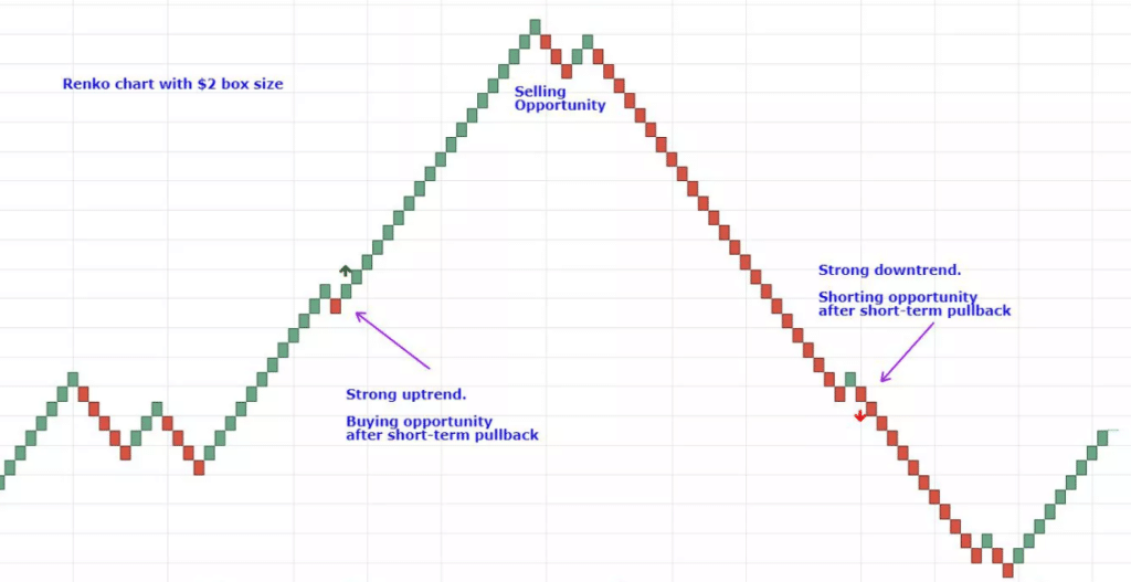 - Wykresy Renko odfiltrowują hałas i pomagają traderom lepiej widzieć trend, ponieważ wszystkie ruchy mniejsze niż wielkość pudełka są odfiltrowywane.