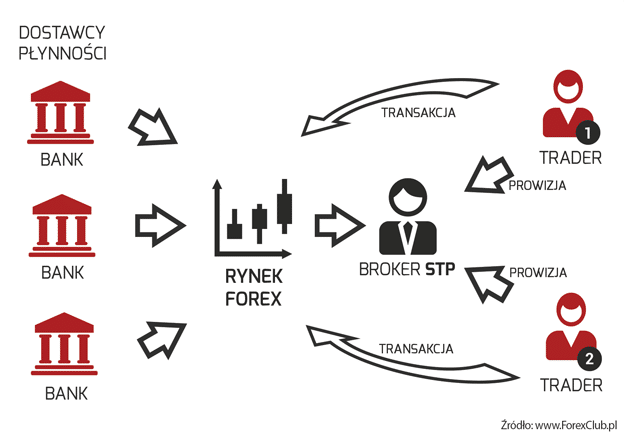 Model Straight Trough Processing (STP) zakłada, że broker jest jedynie pośrednikiem w naszych transakcjach, który anonimowo przekazuje zamówienia dostawcom płynności, z którymi współpracuje, nie zbierając jednocześnie wszystkich ofert w jednym miejscu. Broker STP nie jest stroną transakcji, dlatego unikamy ewentualnego konfliktu interesów. Dzięki temu jest w stanie zapewnić atrakcyjne koszty transakcji i stosunkowo wysoką dźwignię finansową. Jego wynagrodzenie jest uwzględnione w marży lub dodane w formie prowizji od wartości transakcji.