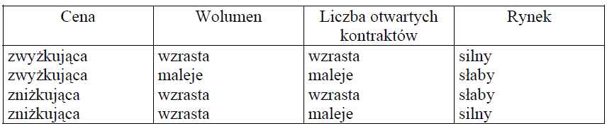 Inwestorzy oceniając sytuację rynkową, obserwują zmiany wolumenu i liczby otwartych pozycji. Poniżej przedstawiono ogólne zasady interpretacji: