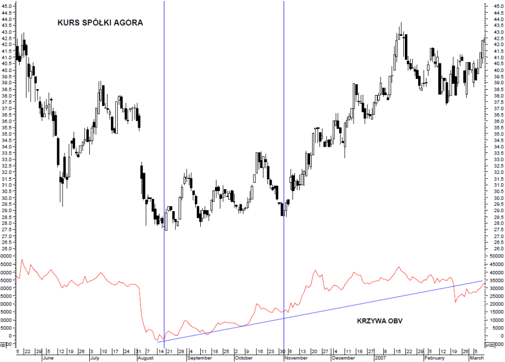 Do analizy zmian zachodzących w zakresie wolumenu obrotów względem ruchu kursu akcji, dobrze sprawdza się linia OBV. Budowa linii OBV jest dość prosta. W zależności od zmian kursu akcji (wzrost lub spadek) wolumenowi przypisuje się wartość odpowiednio dodatnią, lub ujemną. Wzrost kursu spółki przekłada się na uznanie wolumenu ze znakiem wartości dodatniej, natomiast spadek kursu spółki oznacza wolumen ujemny. Aktualne saldo narastające otrzymujemy dodając lub odejmując wolumen z każdego dnia, w zależności od kierunku zmian kursu spółki. Wielkość liczb nie ma znaczenia w przypadku linii OBV, istotny jest natomiast kierunek linii OBV. Przy analizie krzywej OBV stosować można zachowanie względem linii trendu, zachowanie innych elementów analizy technicznej (wsparcia, dywergencje).